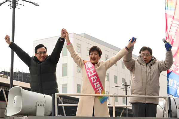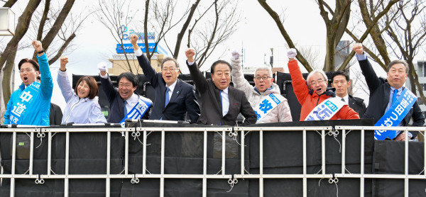 【大阪】「分断より協調、対立より対話の政治を」中道改革連合・尾辻かな子候補の街頭演説会に枝野元立憲民主党代表、公明・杉参院議員が結集